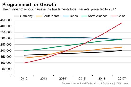 The use of robots in Chinese factories has been growing at a 40% annual rate and China is expected to have more manufacturing robots than any other country by 2017. The rapidity of adoption is shown in the following chart: